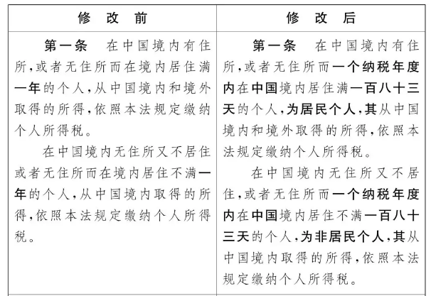 依据财政部部长刘昆关于《中华人民共和国个人所得税法修正案(草案)》的说明,个税法对财政居民的规则已做更改:将“在我国境内居住的时间”作为断定居民个人和非居民个人的依据,由“是否居住满1年”调整为“是否居住满183天”。详细条文更改请见下图: